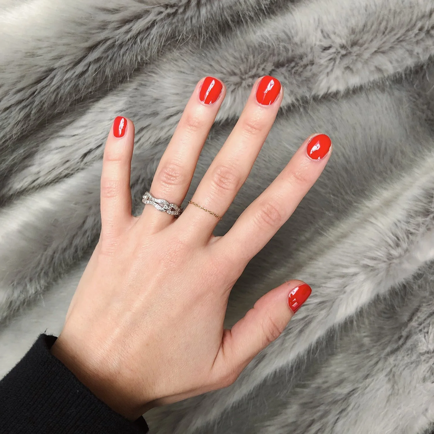 If you are searching for a gorgeous red that you can rock for the holidays (and for the rest of the year, for that matter) then look no further than the color Beauty Marked. Beauty Marked is to red nails what MAC Ruby Woo is to red lips: a classic shade with the perfect balance undertone. On my skin tone it leans a bit warm, which I personally love. If you’re skilled with application, you can get opaque coverage in one coat. I usually do 2 for good measure.