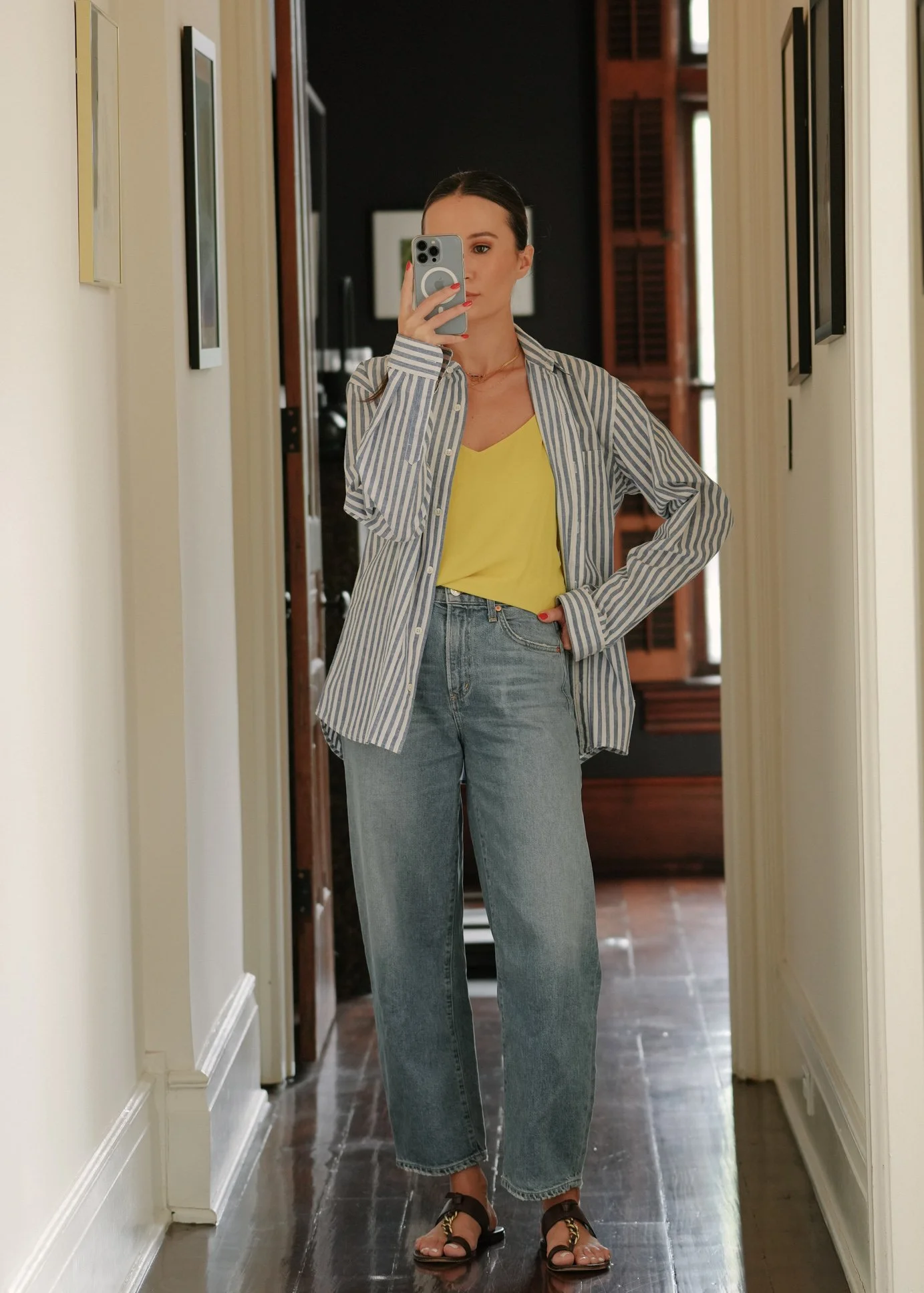 Sezane chambray shirt and white tank | Vince shorts & trousers (old) | Prada sandals (old)