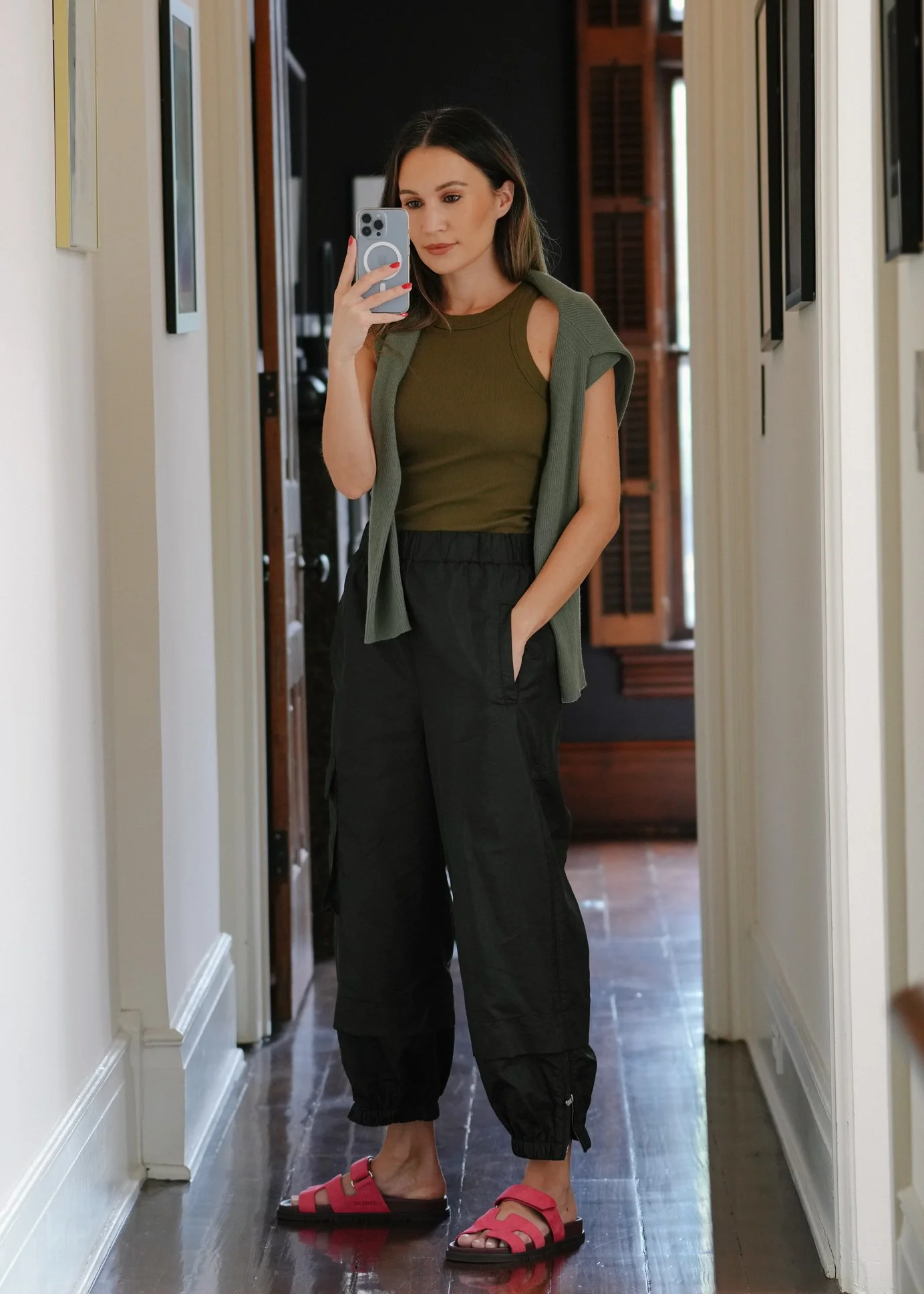 Reformation tank | Tibi joggers | Hermes sandals